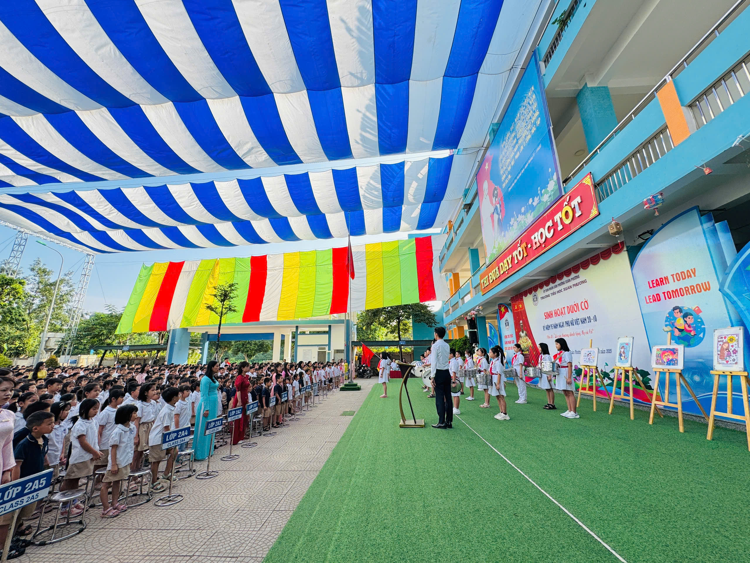 Mở đầu chương trình là nghi thức chào cờ trang nghiêm, toàn thể cán bộ, giáo viên và học sinh cùng hướng về lá cờ Tổ quốc, thể hiện niềm tự hào dân tộc và tình yêu quê hương, đất nước.