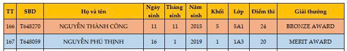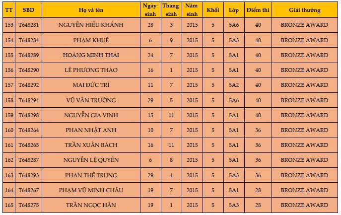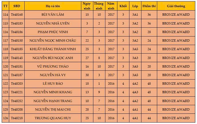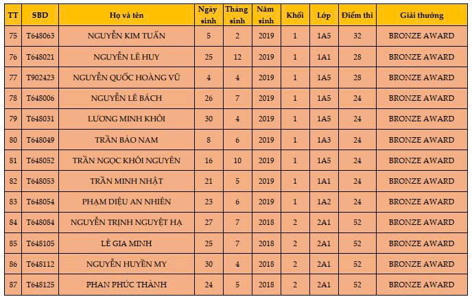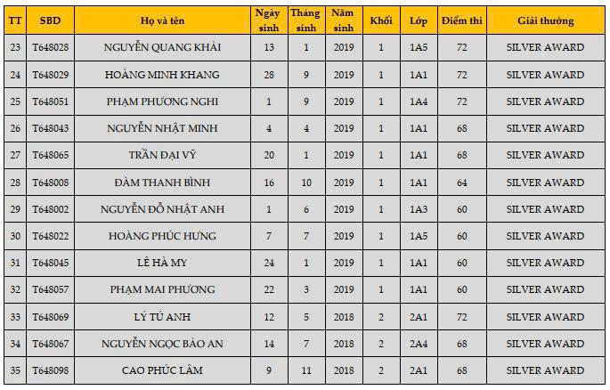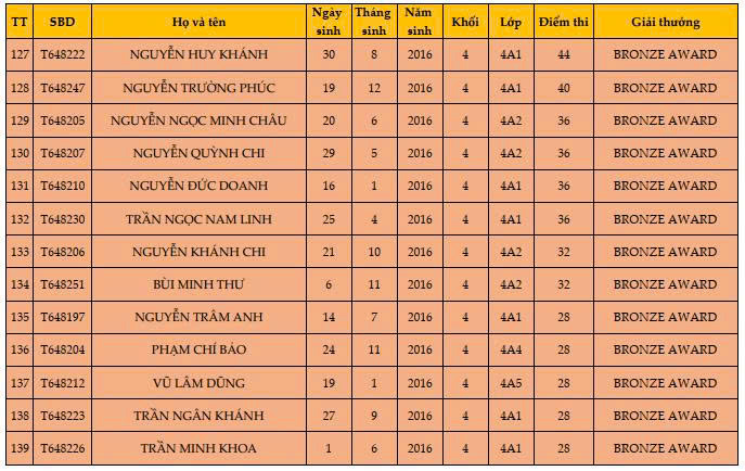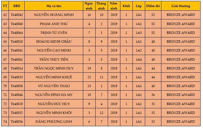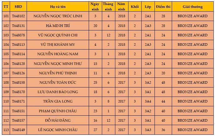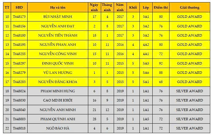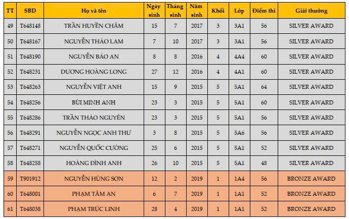 Dưới đây là danh sách các con học sinh đã đạt giải: